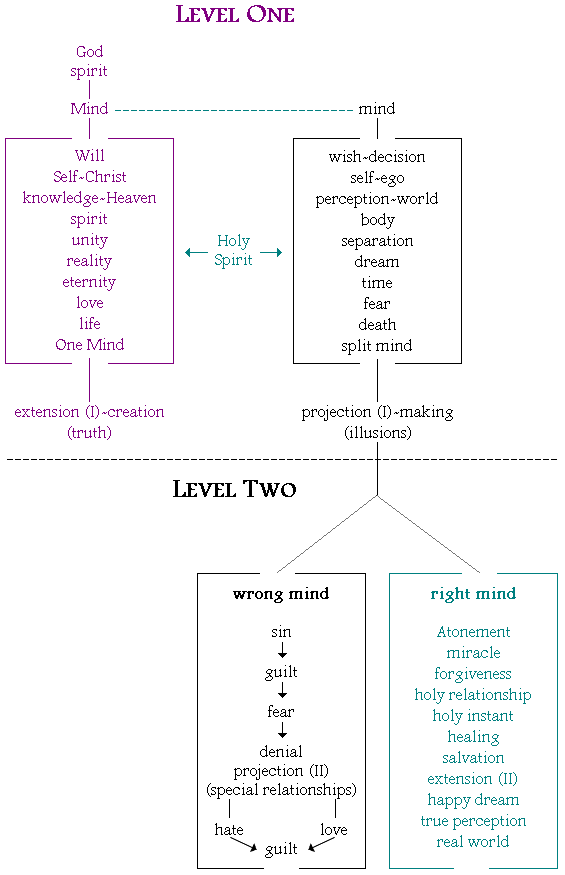 A Course in Miracles, therefore, is written on two levels, reflecting two basic divisions. The first level presents the difference between the One Mind and the separated mind, while the second contrasts wrong- and right-mindedness within the separated mind. On this first level, for example, the world and body are illusions made by the ego, and thus symbolize the separation. The second level relates to this world where we believe we are. Here, the world and the body are neutral and can serve one of two purposes. To the wrong-minded ego they are instruments to reinforce separation; to the right mind they are the Holy Spirit’s teaching devices through which we learn His lessons of forgiveness. On this level, illusions refer to the misperceptions of the ego; e.g., seeing attack instead of a call for love, sin instead of error.